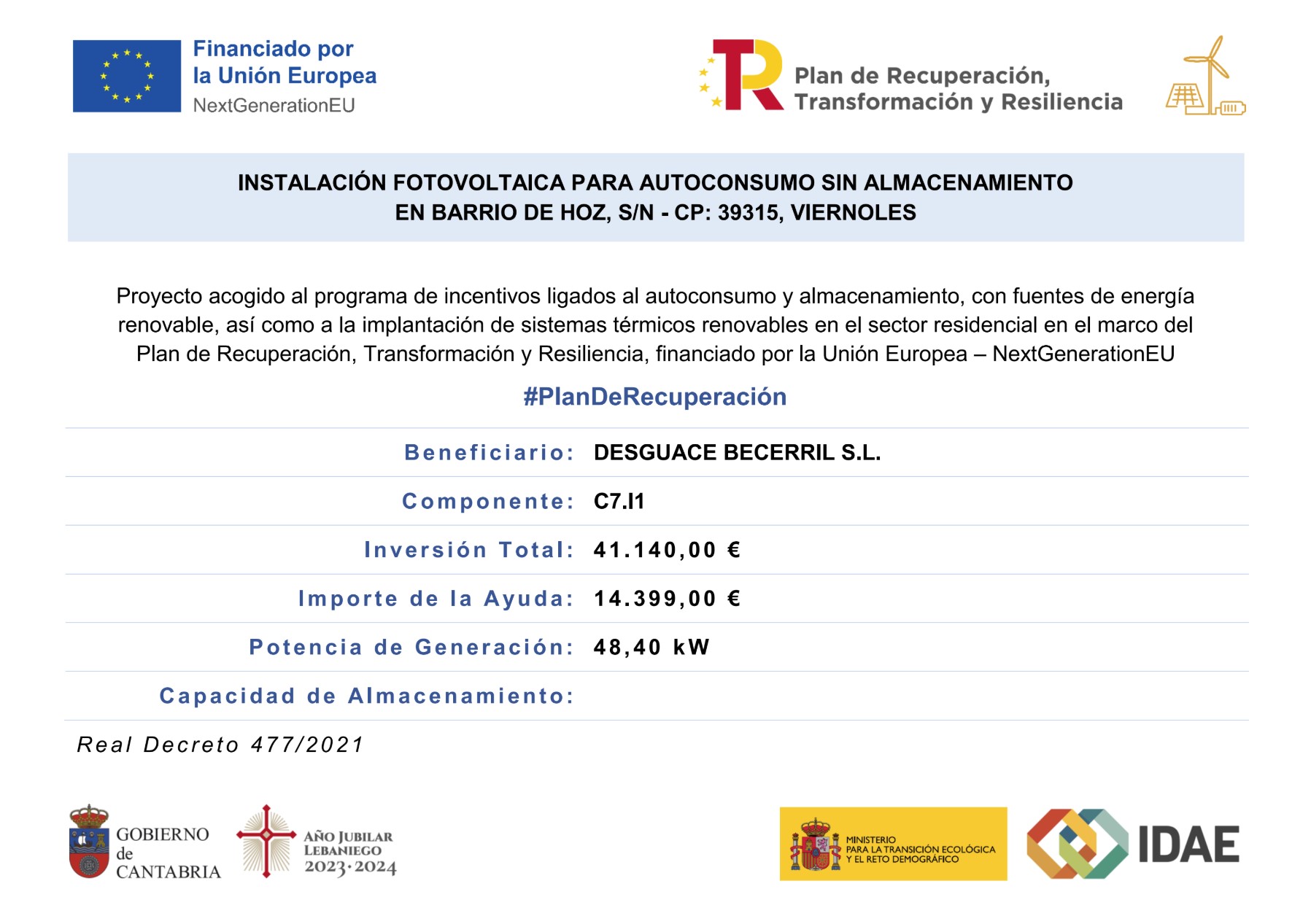 Proyecto subvencionado en el marco del Plan de Recuperación, Transformación y Resiliencia – Financiado por la Unión Europea – Next Generation EU, con el objetivo de mejorar la eficiencia energética en las instalaciones de la empresa.